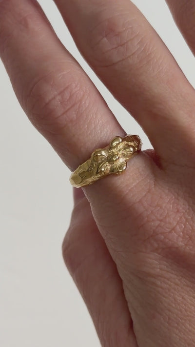 טבעת בלום גולד היא טבעת עדינה שאי אפשר לפספס , עם נוכחות טבעית ורכה. פרח קטן ומעוצב משתלב על טבעת במרקם גולמי, ויוצר שילוב בין נשיות רכה לאופי מעט מחוספס ומלא אופי.