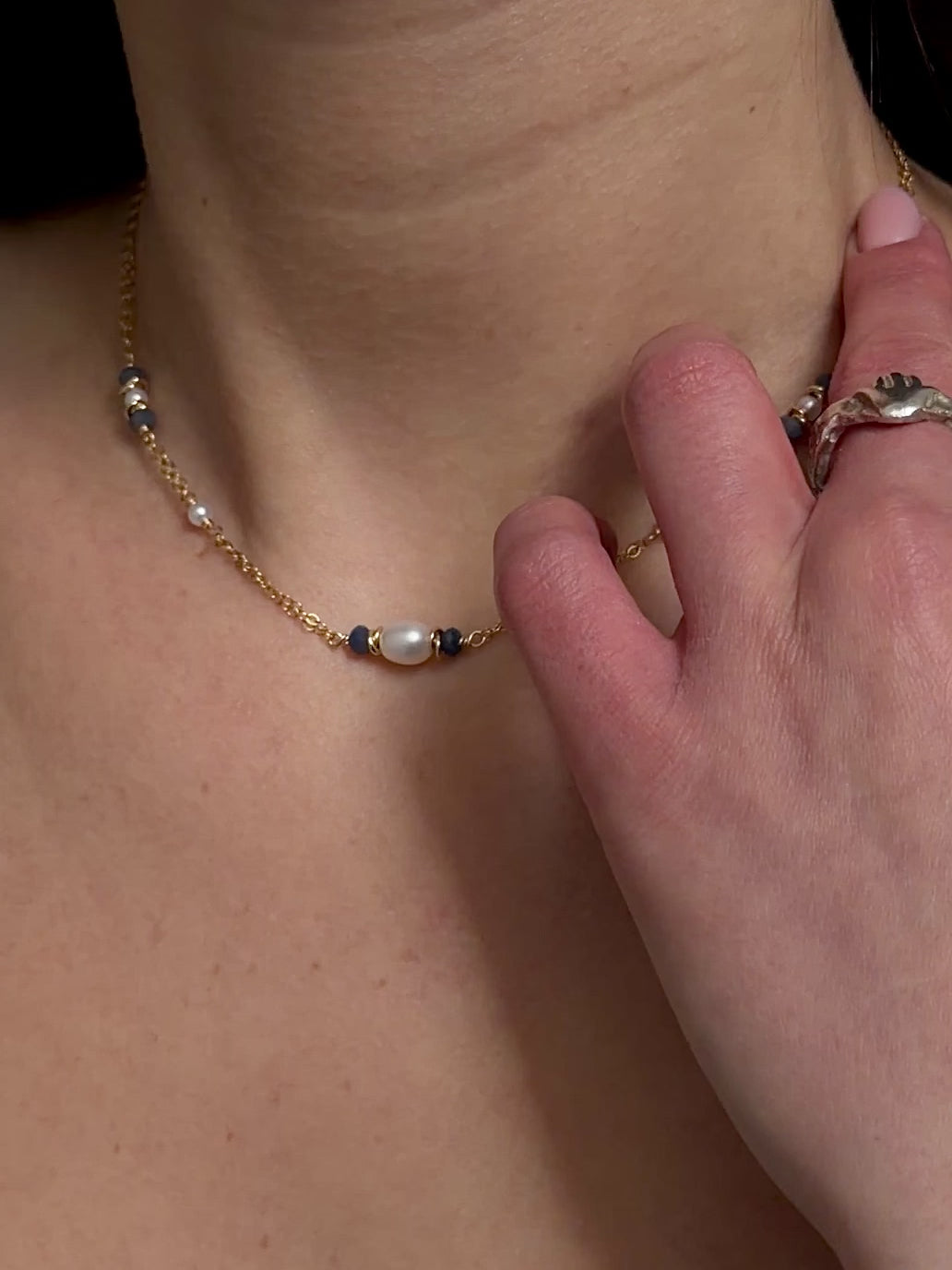 שרשרת נורה אושן גולד עשויה בעבודת יד מפנינים ואבני סלדייט אמיתיות